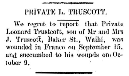 Truscott embarked in Wellington 9th October 1915 for the Suez, Egypt where he disembarked February 1916. Two months later Truscott embarked for France. On 15th September 1916 Rifleman Leonard Truscott was admitted with chest wounds to 12 General Hospital, Rouen, France and died, aged 27 at Rouen France 9th October 1916. He is buried at St Sever Cemetery at Rouen.