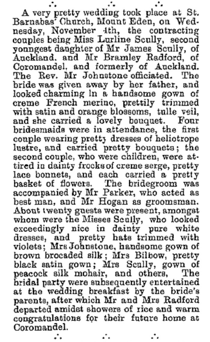 From 1896 to c1914 Radford lived in Coromandel Town where he was a miner. Sometime prior to 1919, Radford and his family moved to Symonds street, Waihi where his occupation was battery hand. By 1928 he was living at 9 Victoria Ave, (renamed Horoeka Ave) Mt Eden, Auckland, occupation: artist. Three children were born to the couple: Amy Lurline b: 1897, Jack B J b: 1899 and Gladys b:1901. Bramley James Radford died 21st December 1934.